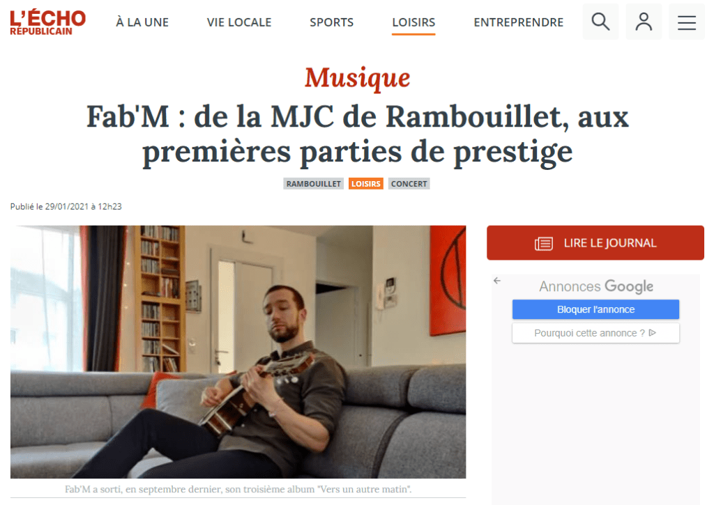 Article dans l’ÉCHO RÉPUBLICAIN By Fab'M sur 1 février 20211 février 2021 View All Posts Vendredi 29 janvier, vous m’avez peut-être croisé dans les pages du journal l’ÉCHO RÉPUBLICAIN ou bien sur le site web du quotidien. Merci à Nathan Sportiello pour ce bel article. LIRE L’ARTICLE Partager : Cliquer pour partager sur X(ouvre dans une nouvelle fenêtre) X Cliquez pour partager sur Facebook(ouvre dans une nouvelle fenêtre) Facebook J’aime chargement… Similaire